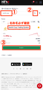 ストラテジーをフォローの項目まで画面をスライドしたら検索ウィンドウ(以下画像①)が出てきますので「zenith copy」と入力し検索ボタン(画像②)を押します。
