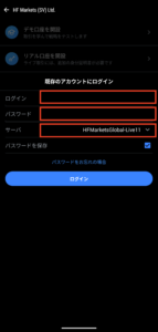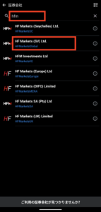 「証券会社を検索」と書かれている欄で「hfm」と入力し、表示されたサーバ群から「HF Markets (SV) Ltd.」を選択します。
